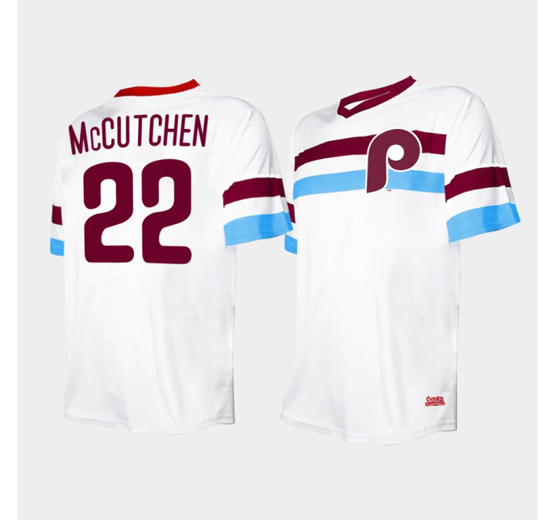 Elevate your Phillies pride with the Men's Philadelphia Phillies #22 Andrew McCutchen Cooperstown Collection V-Neck White Jersey by PhilliesFanShop, a striking tribute to a historic baseball milestone. Designed with sleek black-and-white contrast, this jersey channels his iconic energy while showcasing bold Phillies graphics for unwavering team loyalty. Advanced sweat-wicking fabric ensures breathable comfort throughout every inning, whether you're cheering at the ballpark or reliving legendary moments at home. The replica cut mirrors on-field aesthetics with crisp detailing, blending street-ready style and performance durability. From its dynamic sleeve accents to the embroidered team insignia, it's built for fans who demand authenticity without sacrificing everyday versatility. Honor history. Rep boldness.