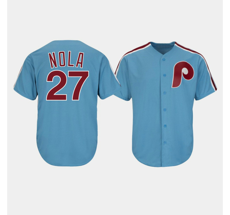 - Phillies #27 Aaron Nola Cooperstown Collection Cool Base Light Blue Alternate Jersey Men's