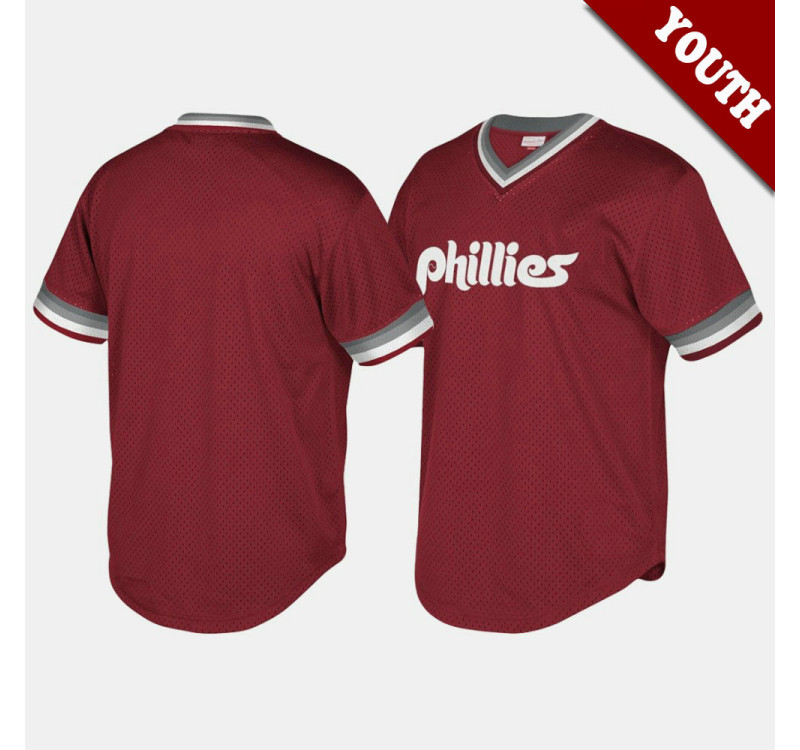 Philadelphia Phillies Cooperstown Collection Mesh Wordmark V-Neck Burgundy Mitchell & Ness Jersey Youth