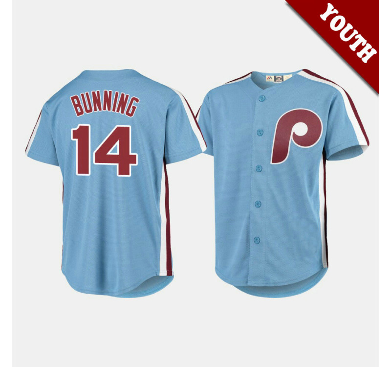 - Kid's Phillies Jim Bunning #14 Light Blue Cooperstown Collection Replica Cool Base Jersey